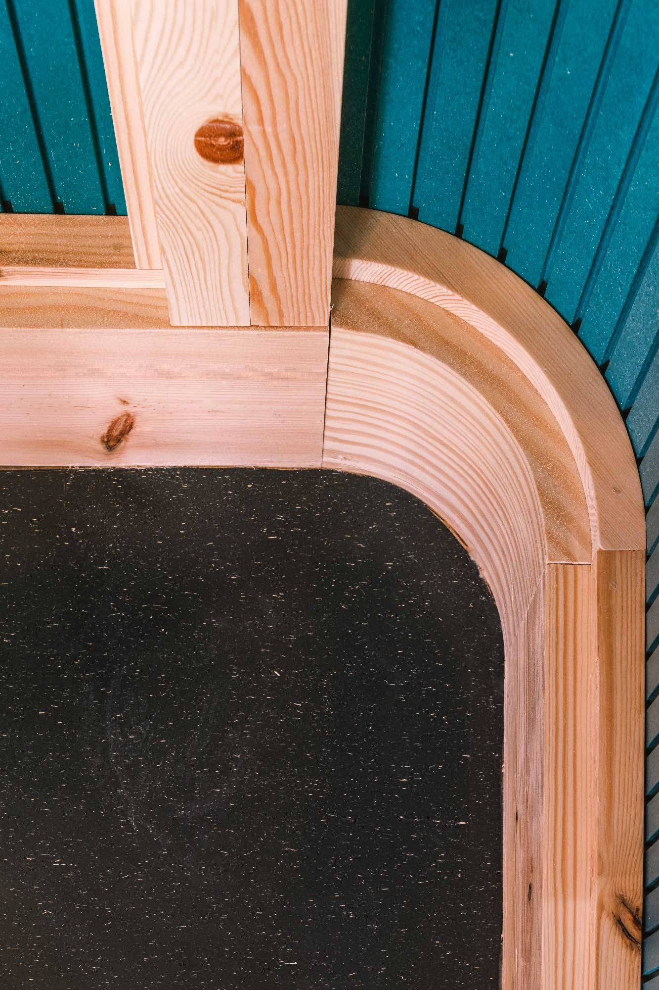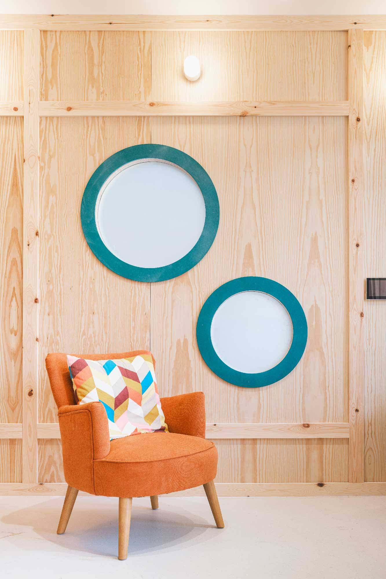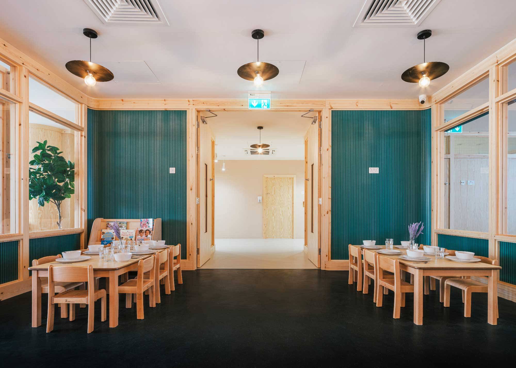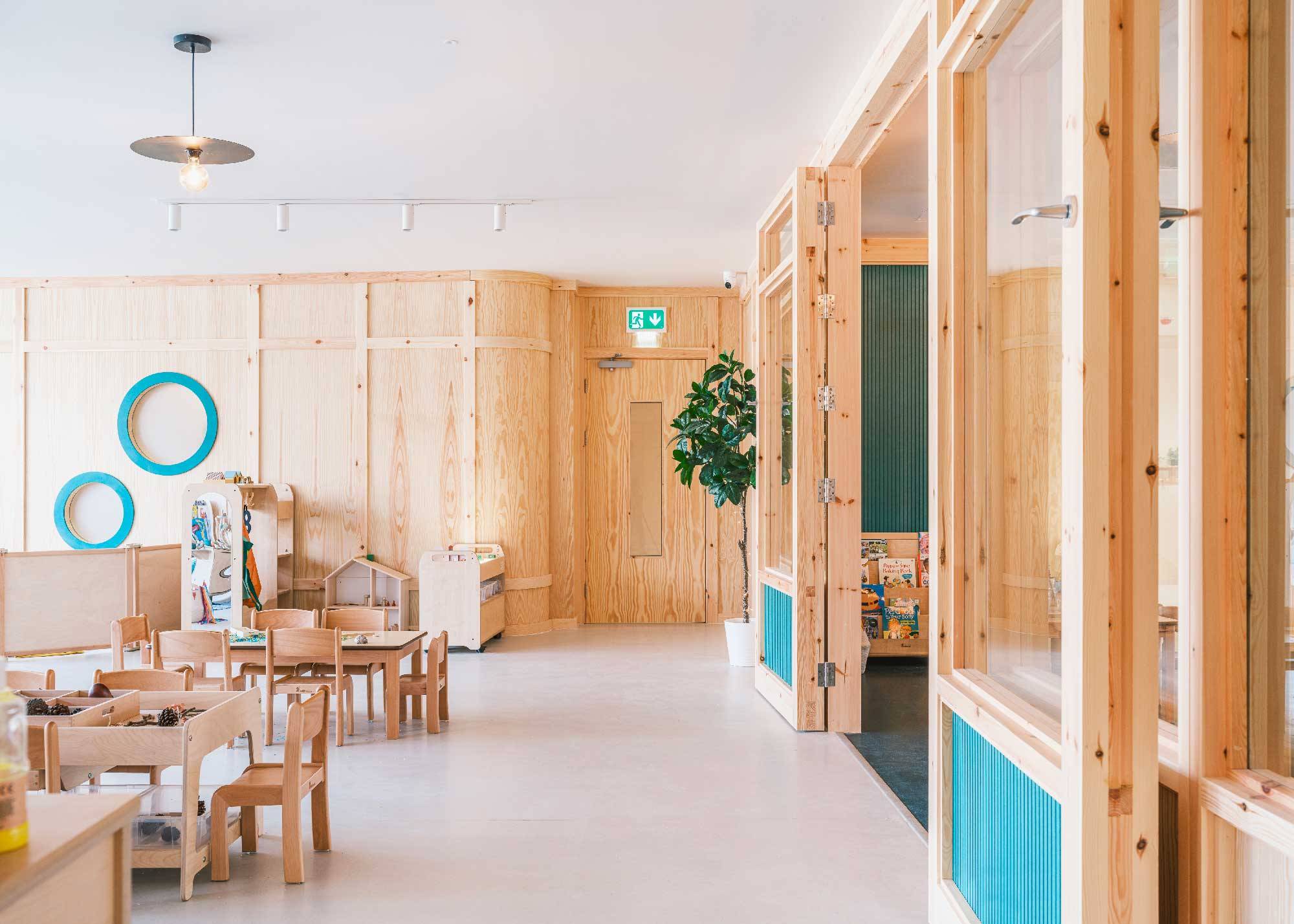 Curved forms are used throughout the Learning Tree Nursery: round arches, playful portholes and curved partition walls. The interior fit-out reflects various education approaches, in particular the Curiosity Approach – a modern child-led learning methodology – that the nursery will use alongside other teaching methods for Early Years children. Natural materials were installed including timber-framed, pine-faced plywood walls, our rubber flooring and low VOC finishes throughout. The choices were purposefully made to introduce young children to a variety of materials and surfaces not usually seen in education spaces.