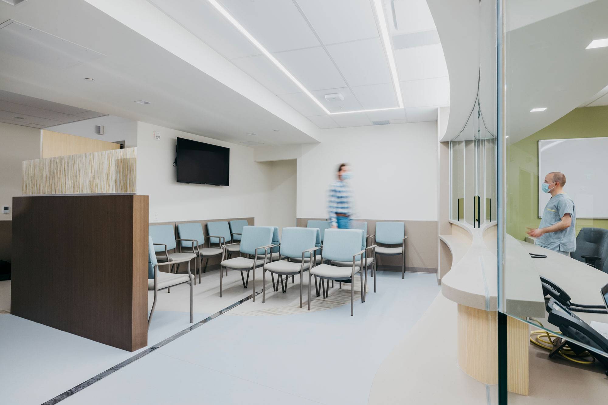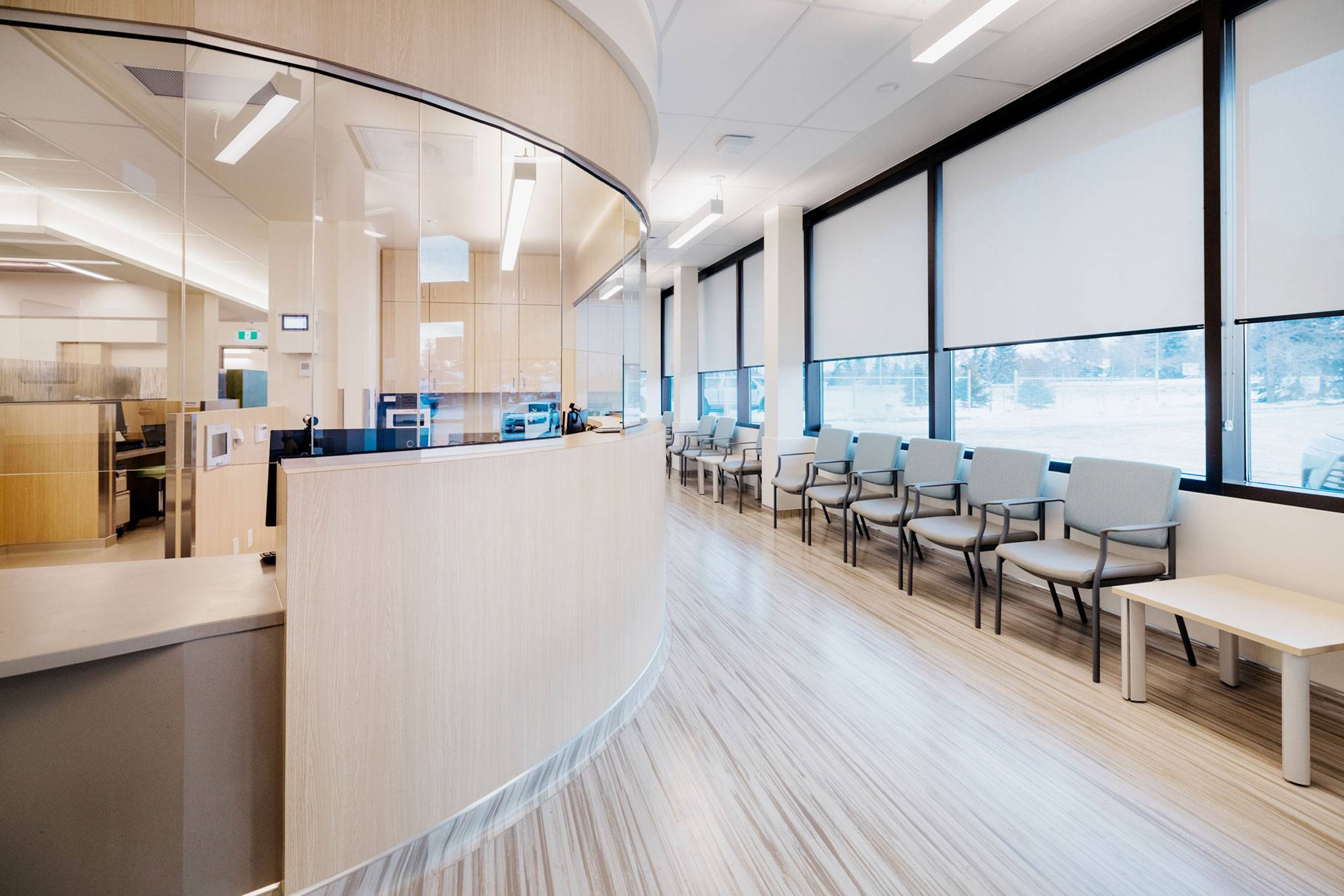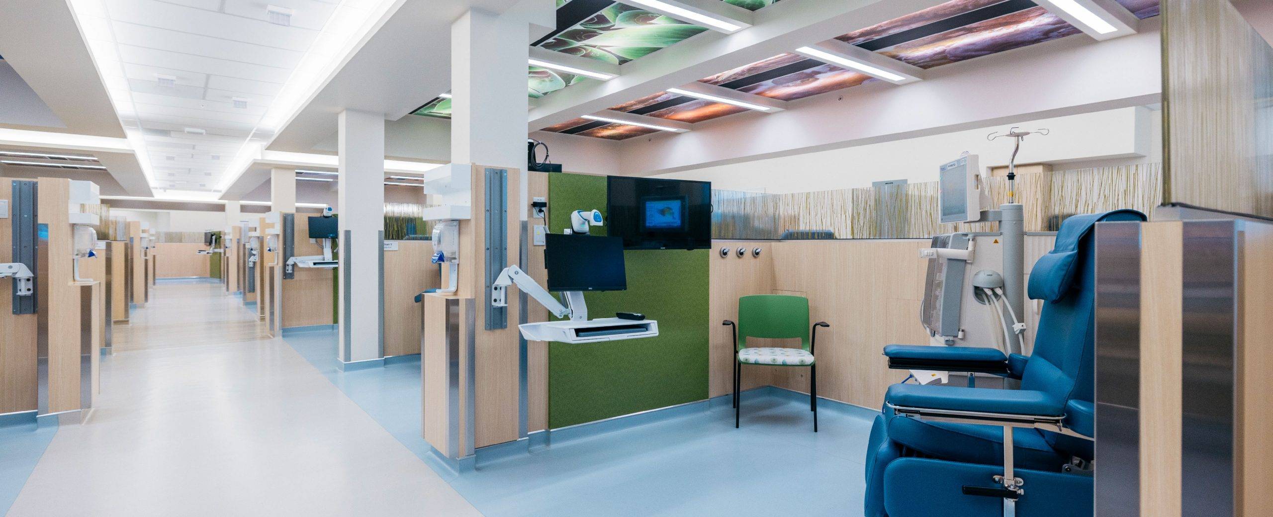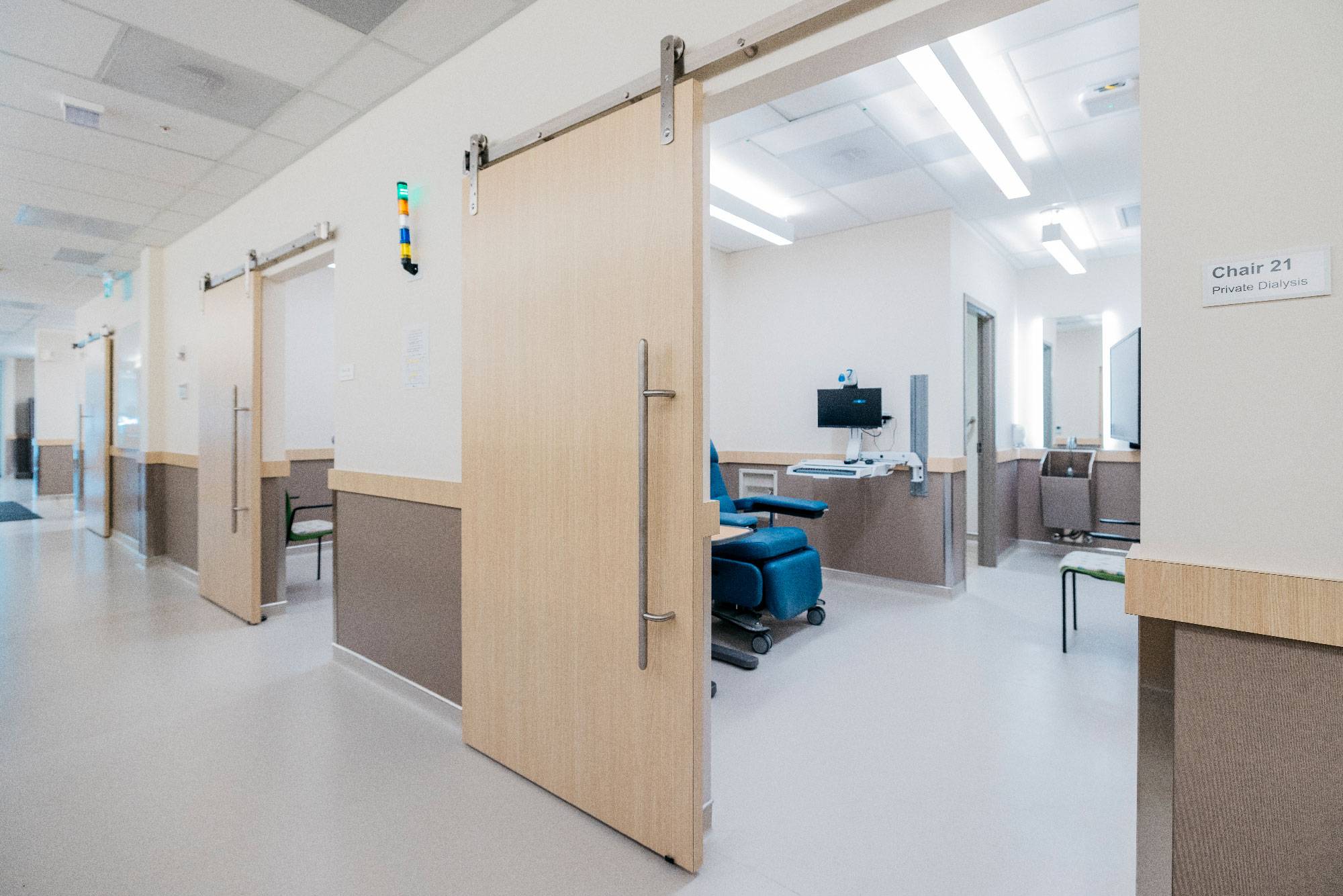 Ogni centimetro quadrato della nuova clinica è stato progettato e realizzato con cura per creare uno spazio che non sia solo funzionale, ma che offra un senso di casa ai pazienti. Data la natura del trattamento dialitico, con pazienti che tornano più volte alla settimana per sessioni che durano ore e ore, è fondamentale che la clinica offra un ambiente accogliente e piacevole in cui tornare più volte. L’interno della clinica è uno spazio ben progettato e realizzato che consente al personale clinico di fornire un’assistenza eccellente ai pazienti. La strategia di progettazione dello spazio dà priorità al benessere fisico ed emotivo. La struttura comprende immagini tratte da piante locali dell’Alberta, tra cui accattivanti pannelli illuminati a soffitto in acrilico con immagini ad alta risoluzione tratte dall’ambiente naturale, pannelli vetrati con intarsi di erba vera e propria, pareti in cavallino color legno e pavimenti ispirati alla natura, che contribuiscono a creare un’atmosfera calda, tranquilla e accogliente.