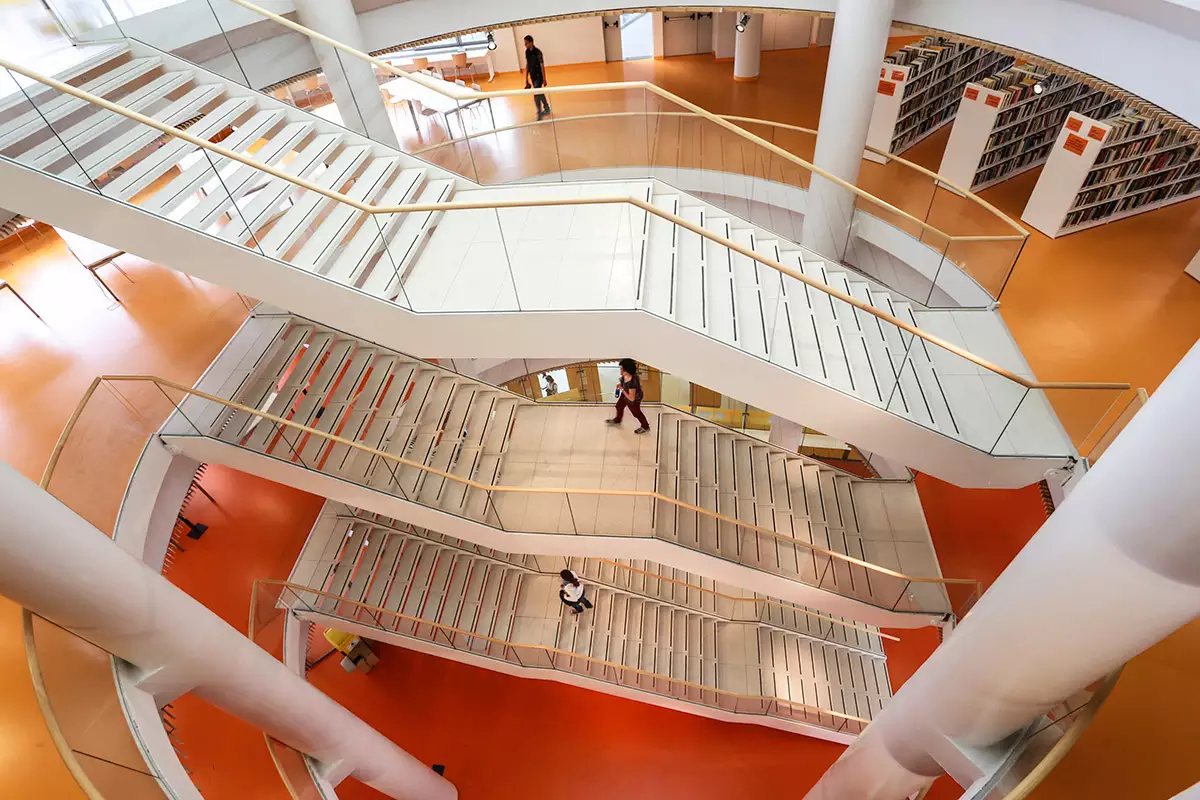 Di particolare interesse è la Biblioteca dedicata al filosofo Norberto Bobbio, progettata dallo studio Camerana & Partners. È proprio nella Biblioteca, con una superficie di 10.000 mq, che si è concentrato il nostro lavoro, con la fornitura del pavimento in gomma Nd/Uni in 8 tinte speciali realizzate appositamente per il progetto, che hanno permesso di identificare ogni piano dell’edificio con un colore diverso.