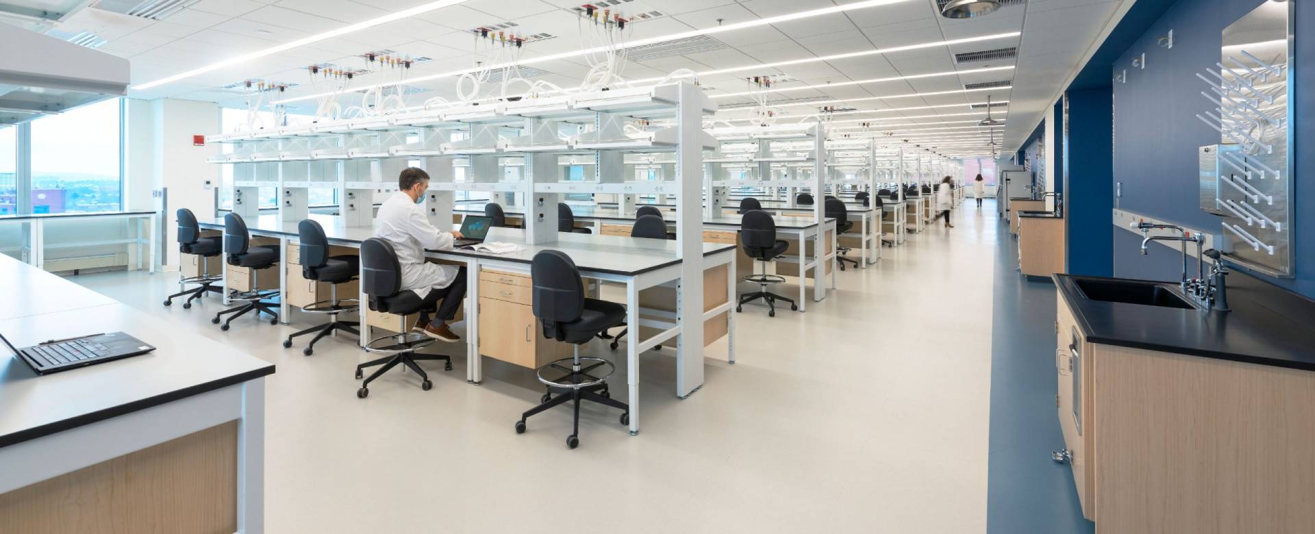 Features of the lab include a highly flexible 750 sqm open lab with natural lighting on three sides. A support corridor lined with equipment and consumables efficiently links this space to 560 sqm of lab support, comprised of robust tissue culture rooms, cold rooms, microscopy, procedure room, and freezer farm. Our Kayar rubber flooring in the K64 and K104 colors is featured throughout the building for a surface of 1180 sqm.