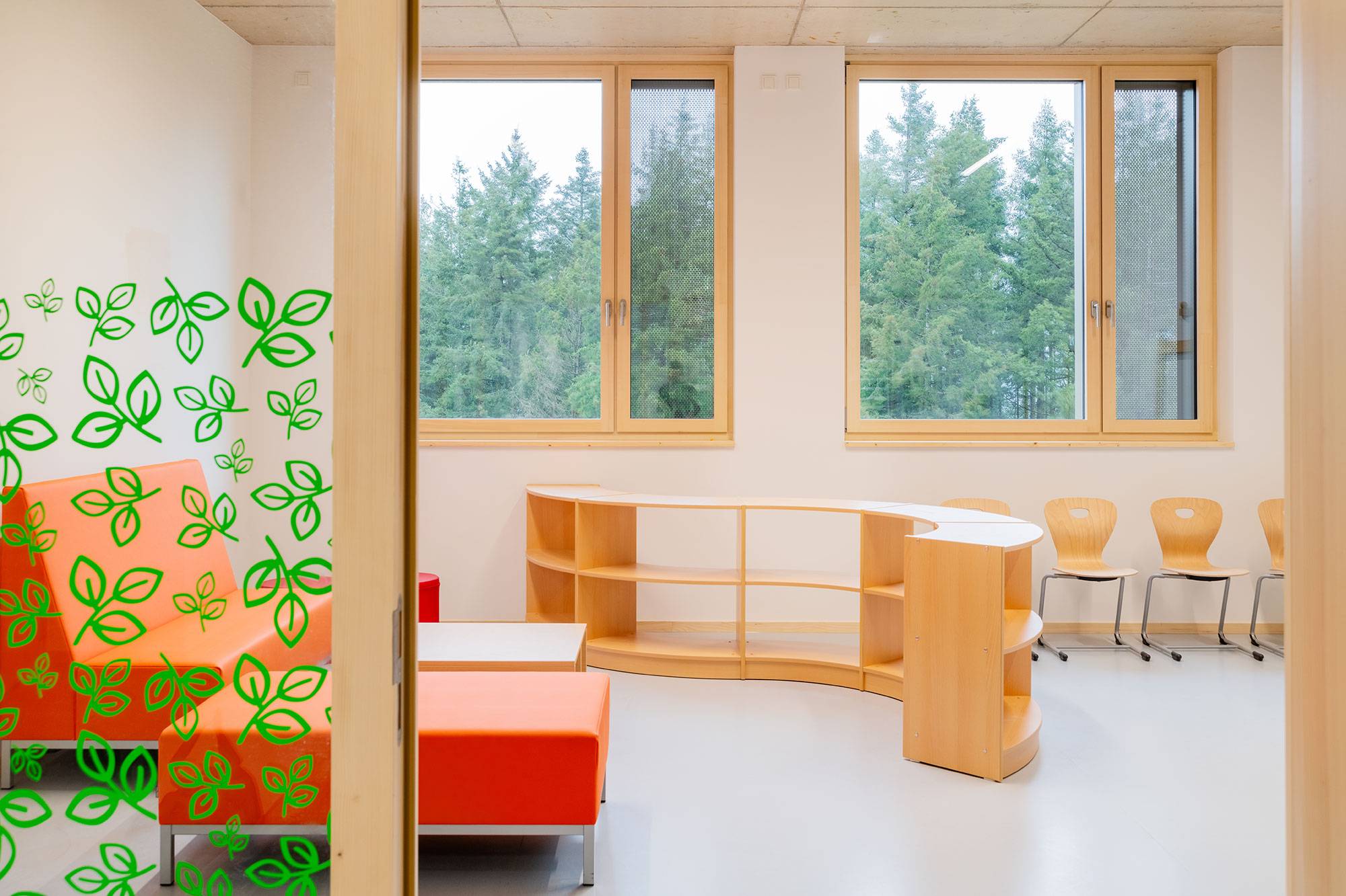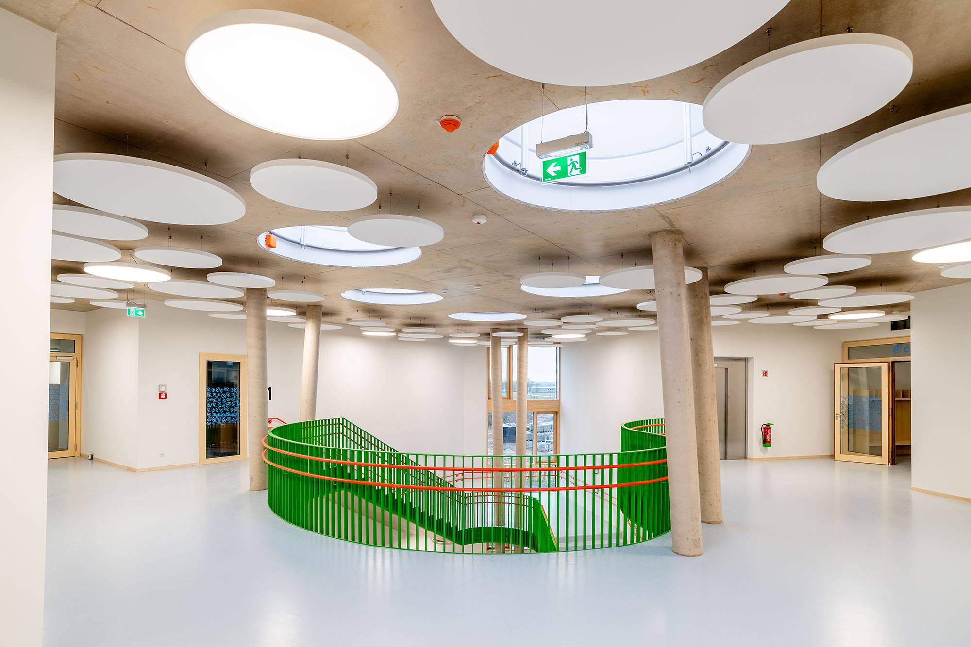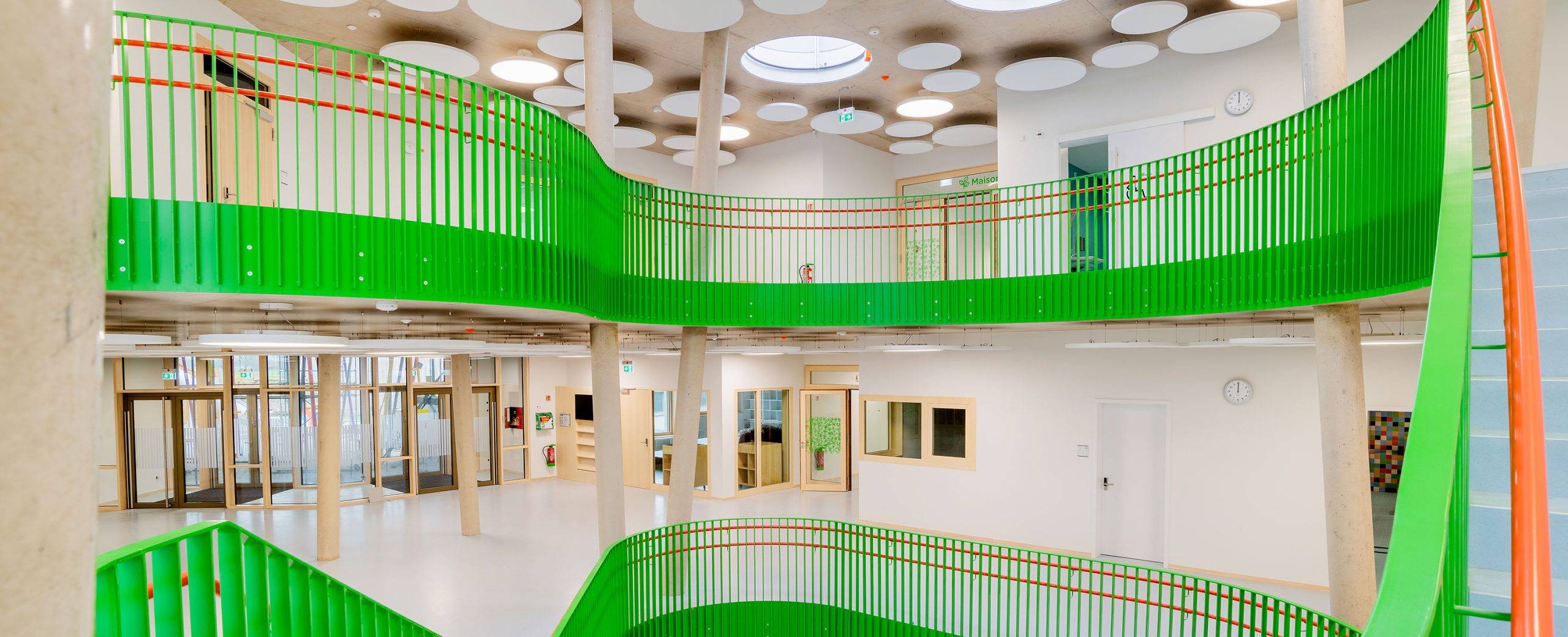 The project includes a primary school for cycles 1 to 4, a day care center for up to 360 children, a music school, a triple sports hall, a central kitchen, and various additional spaces. All of this is complemented by extensive outdoor facilities located on a gently sloping site, in the heart of a green landscape between the villages of Eschdorf and Heiderscheid, in northern Luxembourg. Color is present in several places (slats on the facade, railings, posts in the courtyard) and combines with more neutral elements. A sustainable and eco-responsible approach is also developed: untreated wood facade, green roof, photovoltaic panels, skylights, heat pump… The natural spaces accompany the children who benefit from an awareness of climate issues. Accessibility is optimized to promote sustainable transportation.