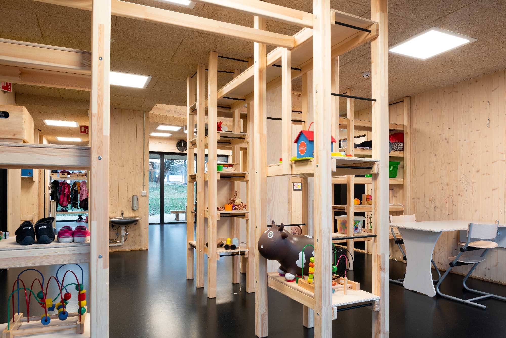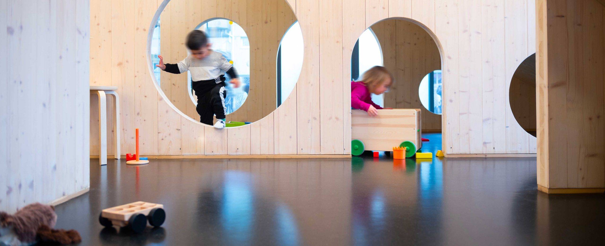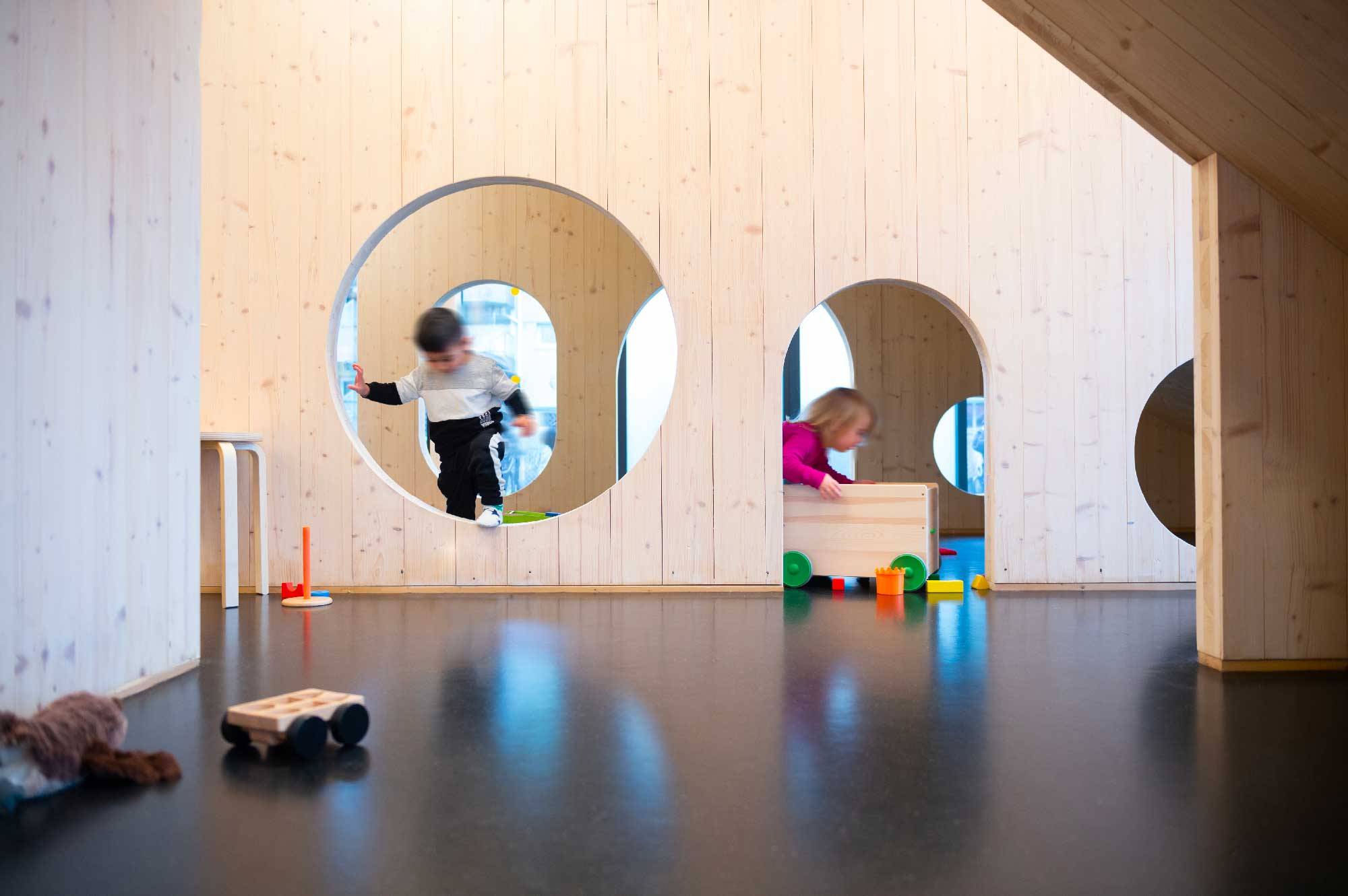 Form, light, colors, materials, sounds and microclimate have been important parameters during the design process. The architects appealed to children’s imagination and understanding of the world and designed a kindergarten where the building itself is a mentor and a safe environment for the children. At the same time, the kindergarten facilitates play, learning, and physical activity through spatial contexts where light and shadow, and variation in room sizes and sounds create extraordinary places.