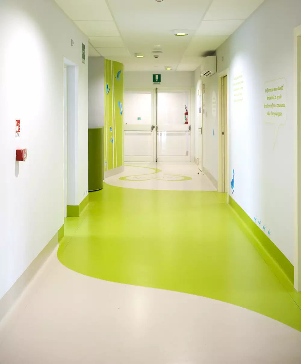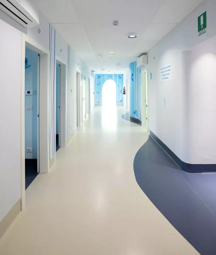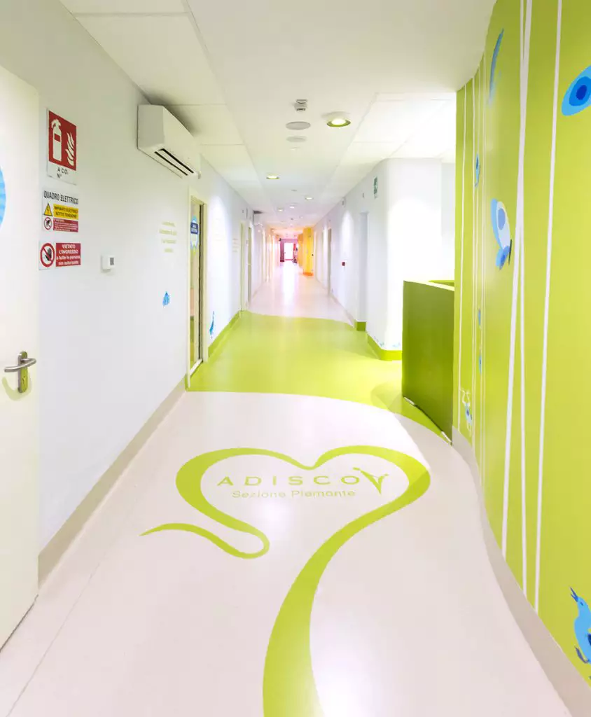 After the Isola di Margherita ward, the Emergency Room and the Pediatric Onco-Hematology ward, this time our newest rubber flooring, Dharma, was introduced into the complex, in a multitude of colours (D18 – D20 -D05 – D06 – D02 – D17 – D19) for a total surface of 1100 sqm, the whole surface of the ward.