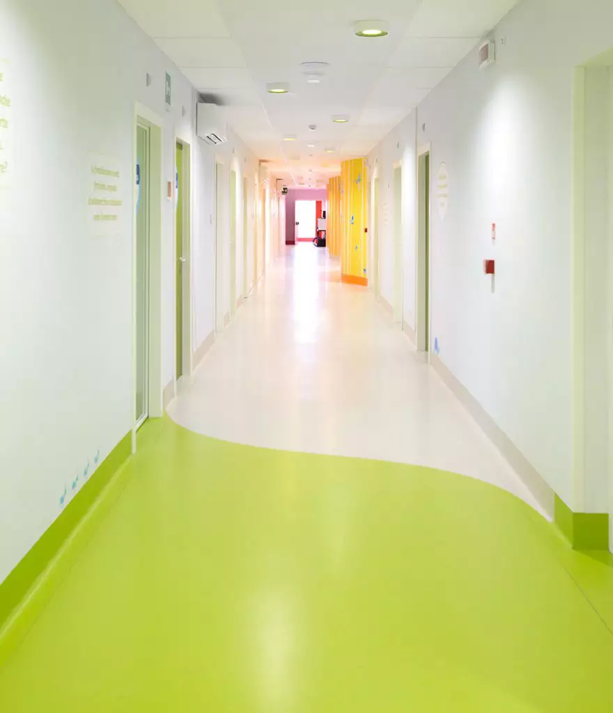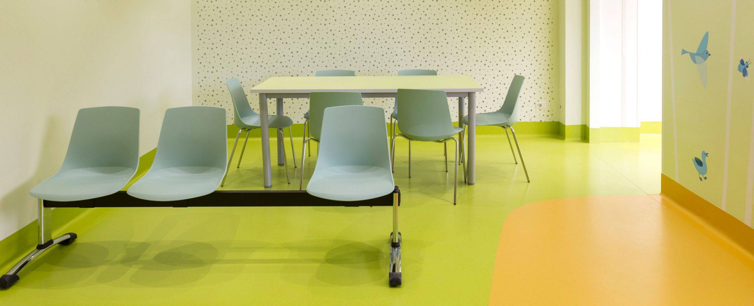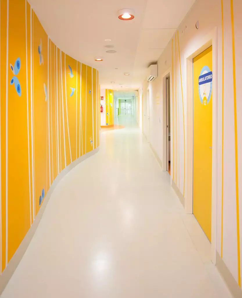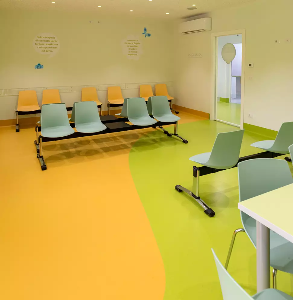 After the Isola di Margherita ward, the Emergency Room and the Pediatric Onco-Hematology ward, this time our newest rubber flooring, Dharma, was introduced into the complex, in a multitude of colours (D18 – D20 -D05 – D06 – D02 – D17 – D19) for a total surface of 1100 sqm, the whole surface of the ward.