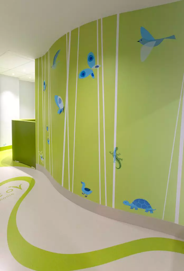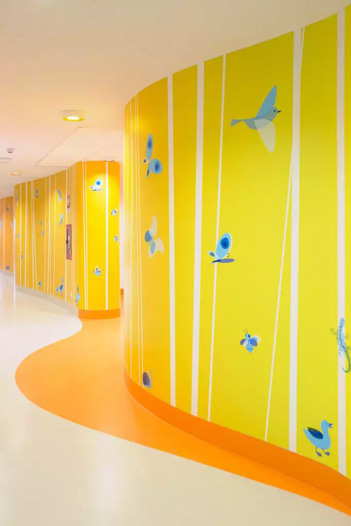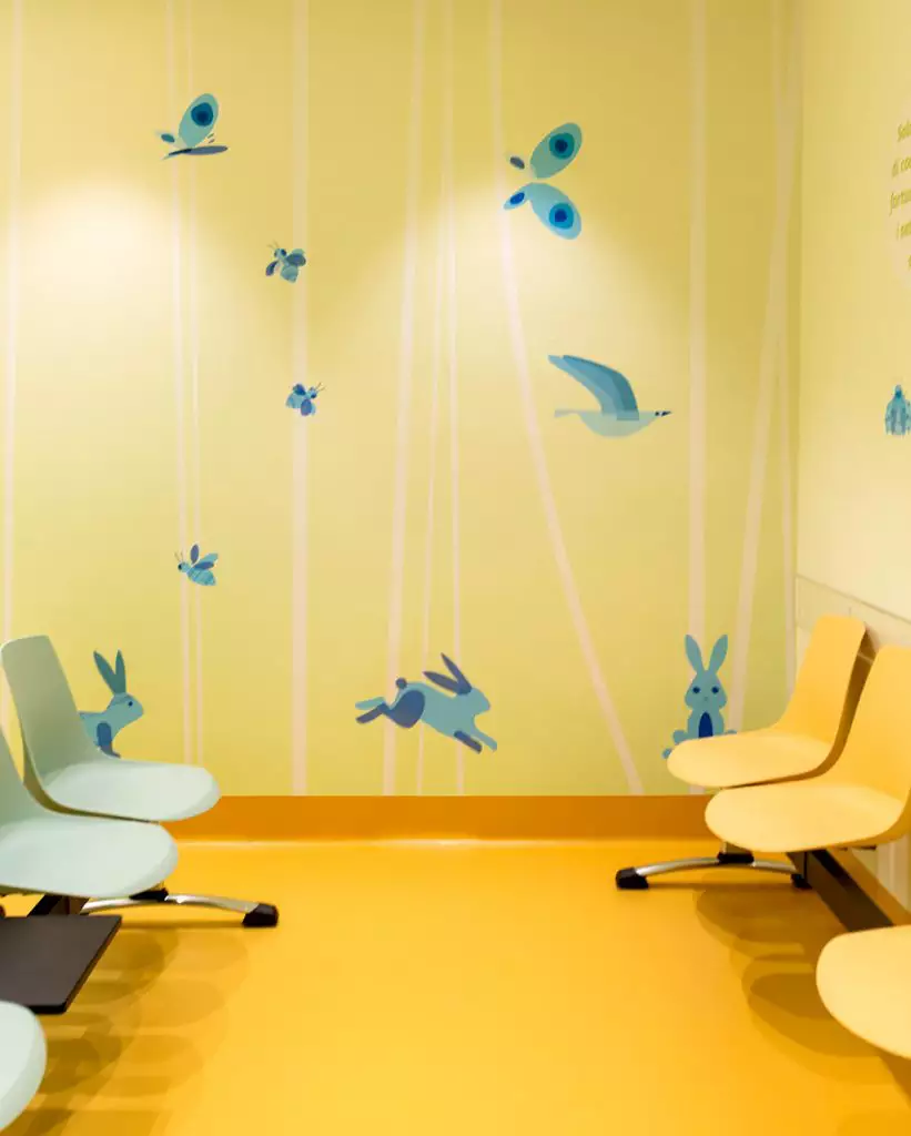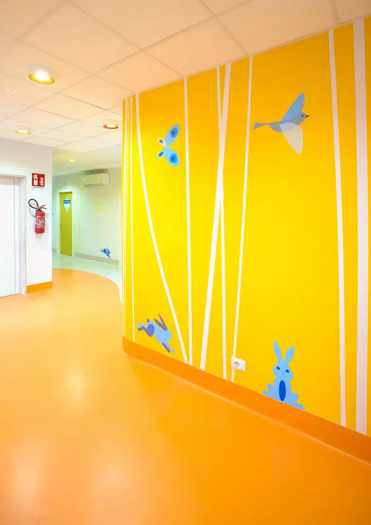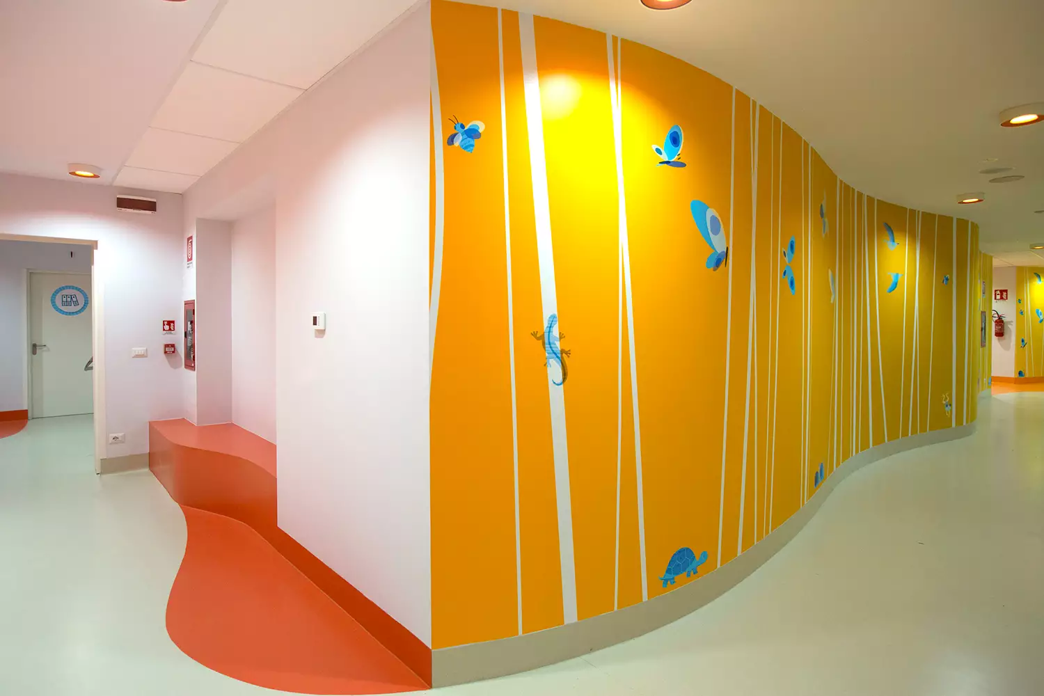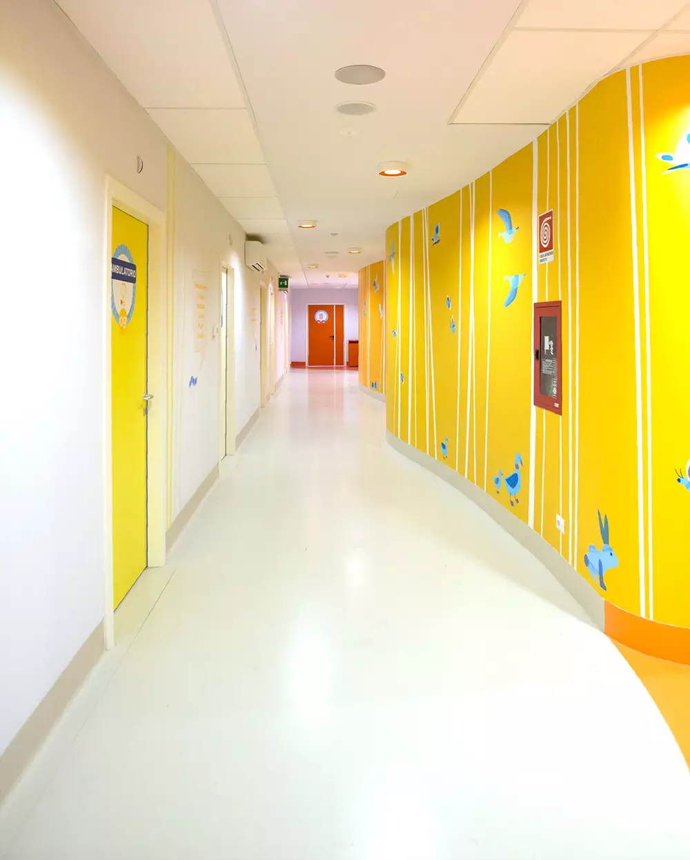 How to make children (and their families) waiting for exams and visits feel light-hearted and serene? Studio Miroglio+Lupica, continuing in their ongoing effort to “humanise” hospital wards, made a thorough use of color and illustration to literally create “fantasy worlds” on the walls of the wing.