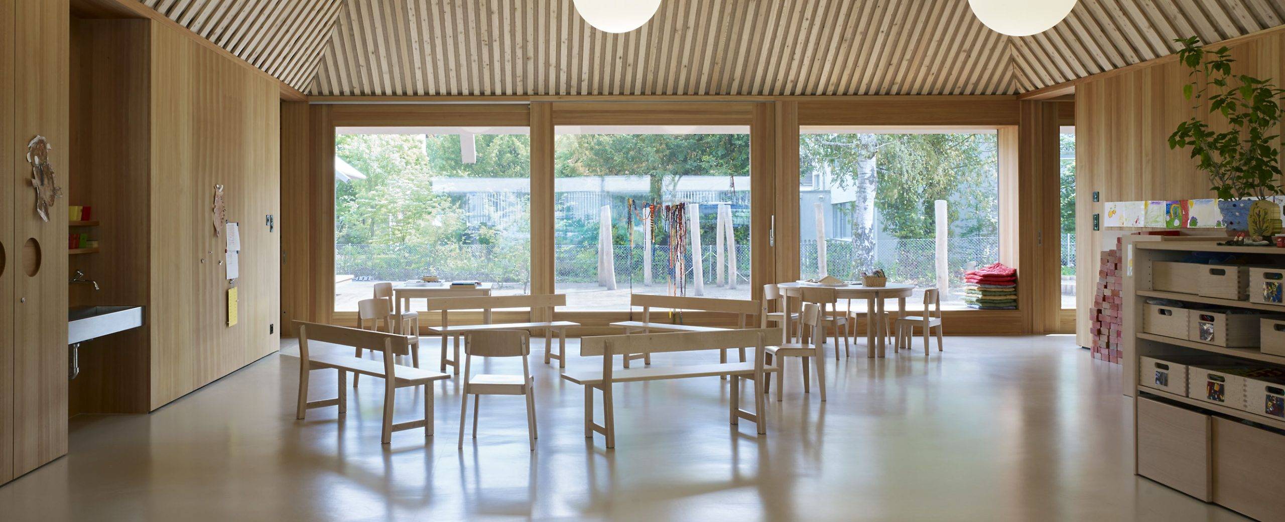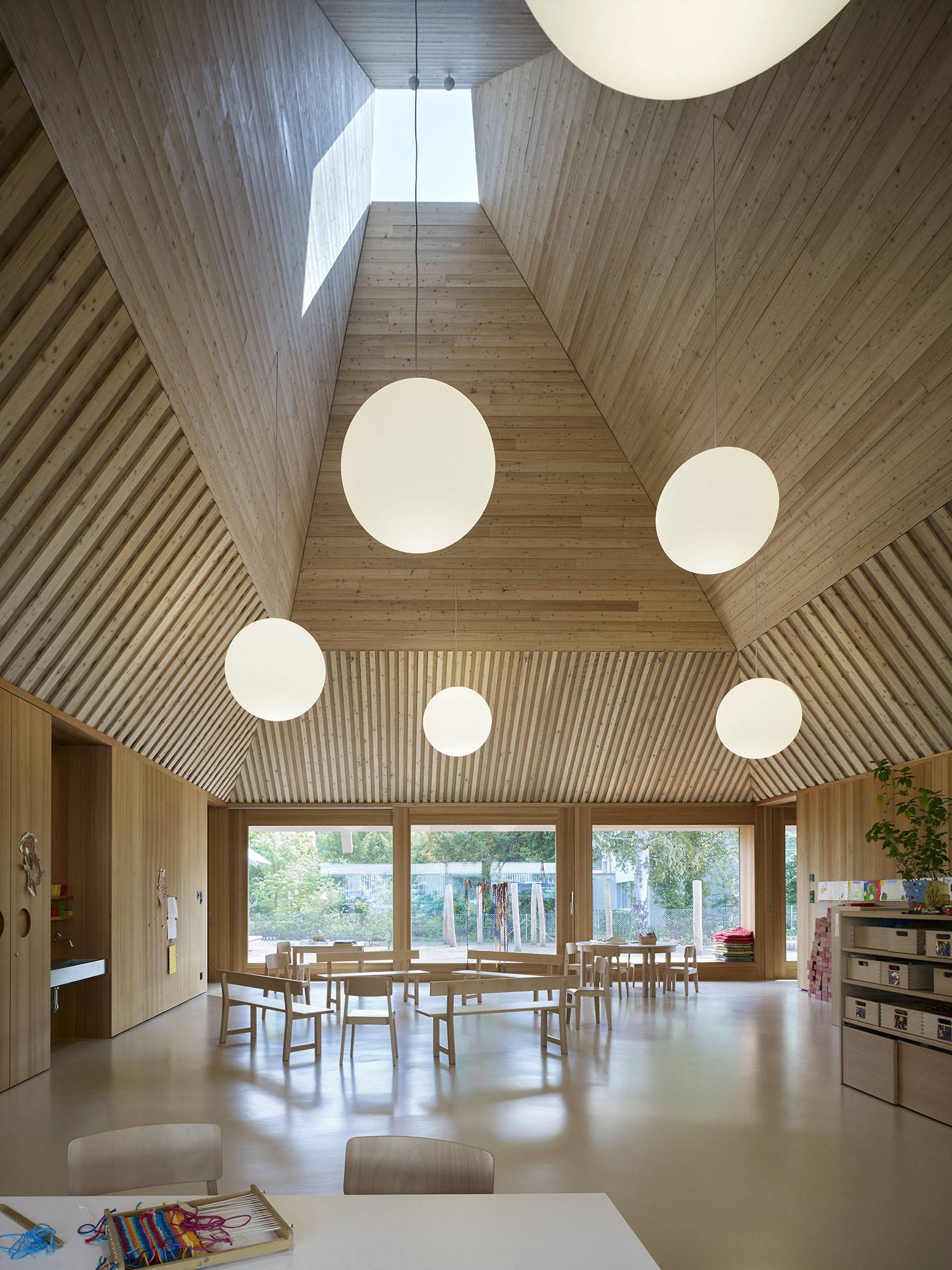 The building’s design is very deliberate and precise. Its volumetric proportions fit seamlessly into the small-scale environment. Both the double kindergarten and the day care center have separate entrances, thus providing clear addressing. There are no corridors; the rooms are designed as a continuous enfilade. While the main rooms extend to the ridge of the roof, can be flexibly furnished, and are additionally illuminated by a skylight, the smaller rooms are significantly lower, creating a spatial effect that is connected to the garden. Large windows lead outside to a covered vestibule, created by the meandering façade. A wraparound, rain-protected gazebo is created under the projecting roof.