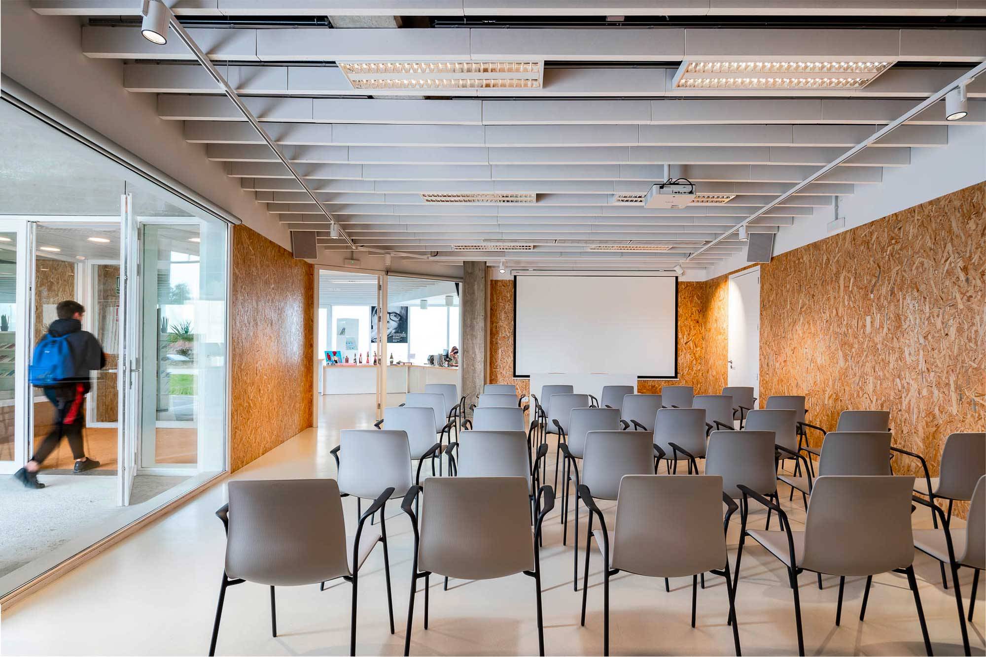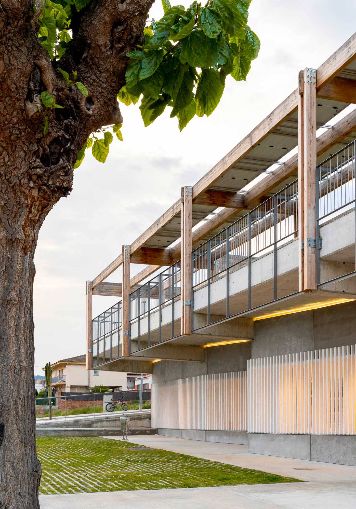 The library is located inside the Parc de la Pau. A one-storey volume, semi-buried to the north and open to the south, adapting to the existing slope.