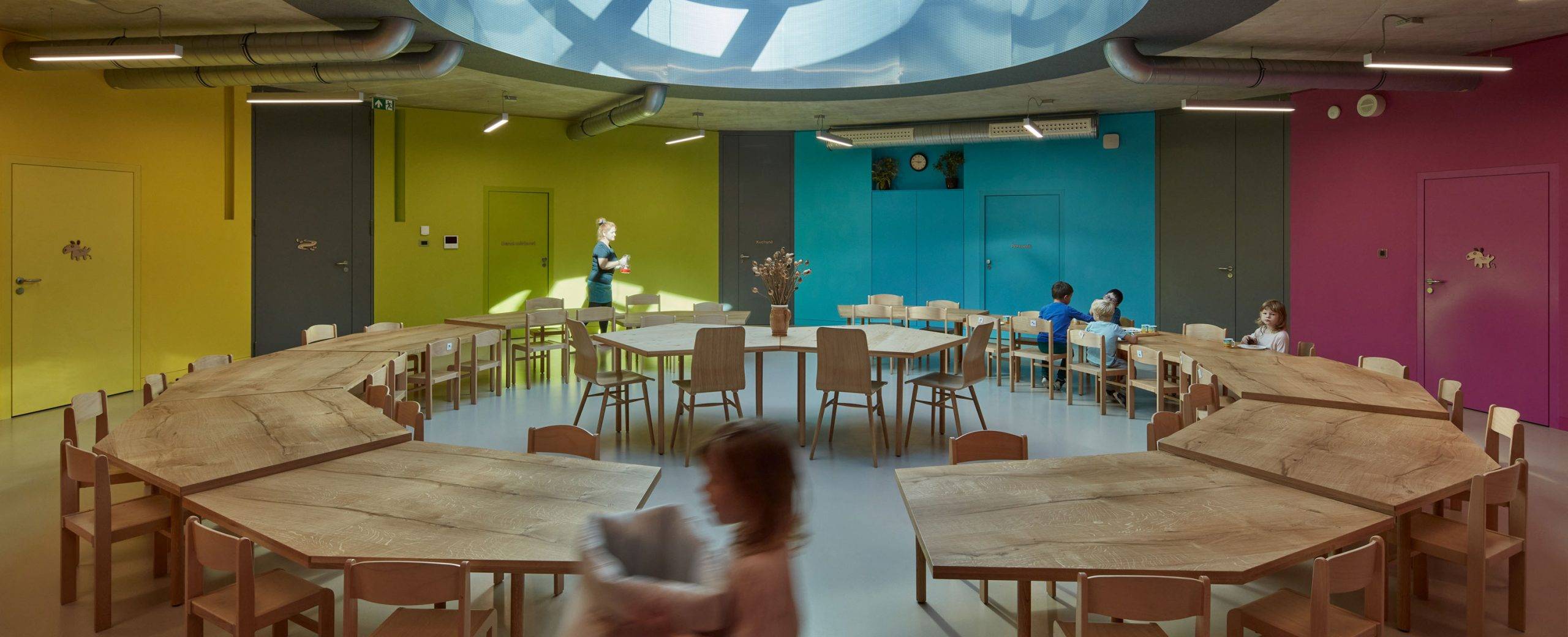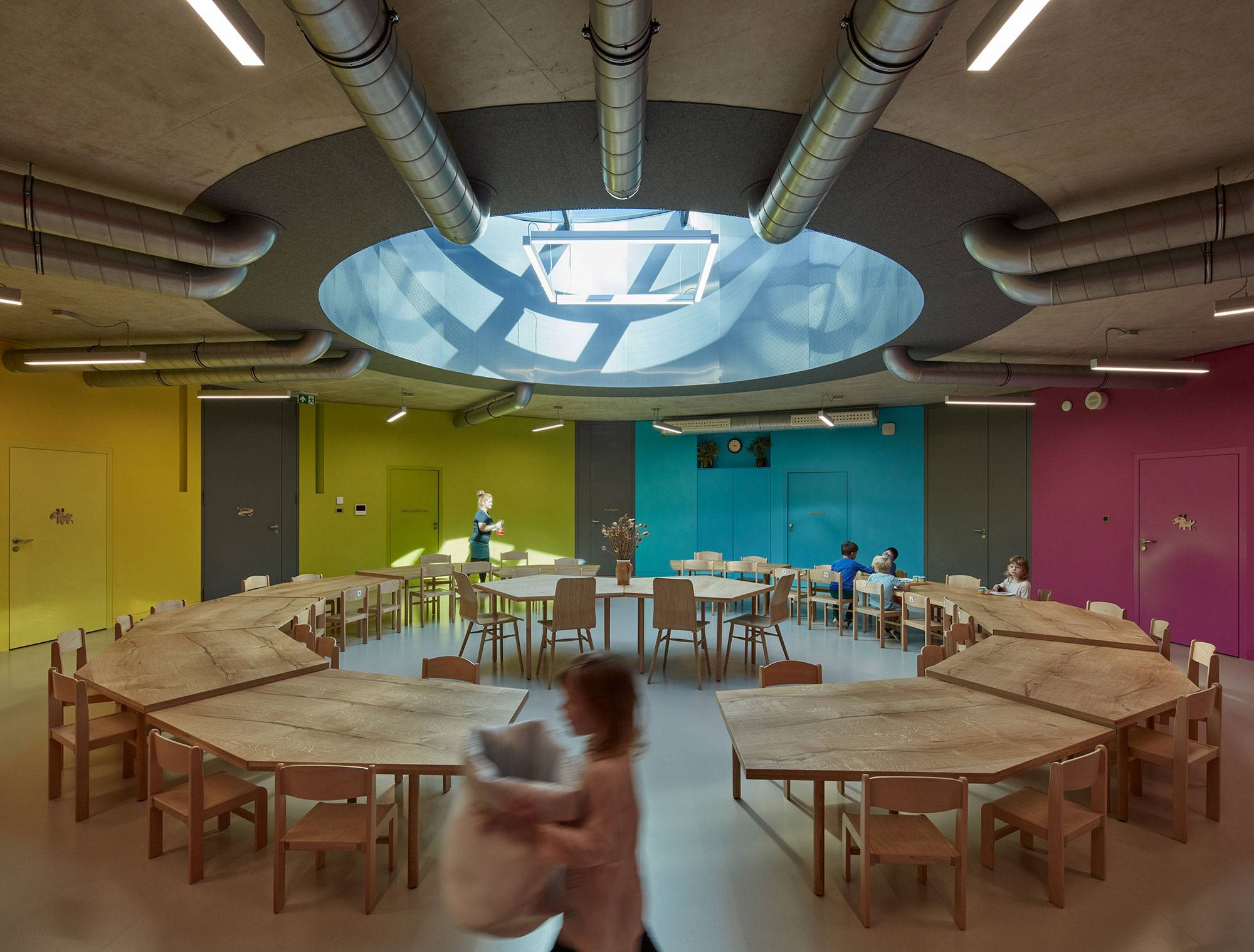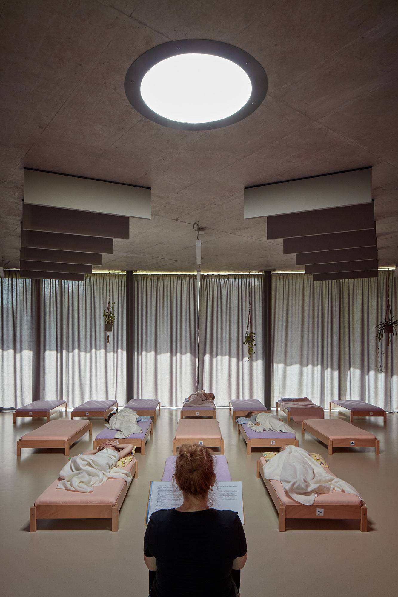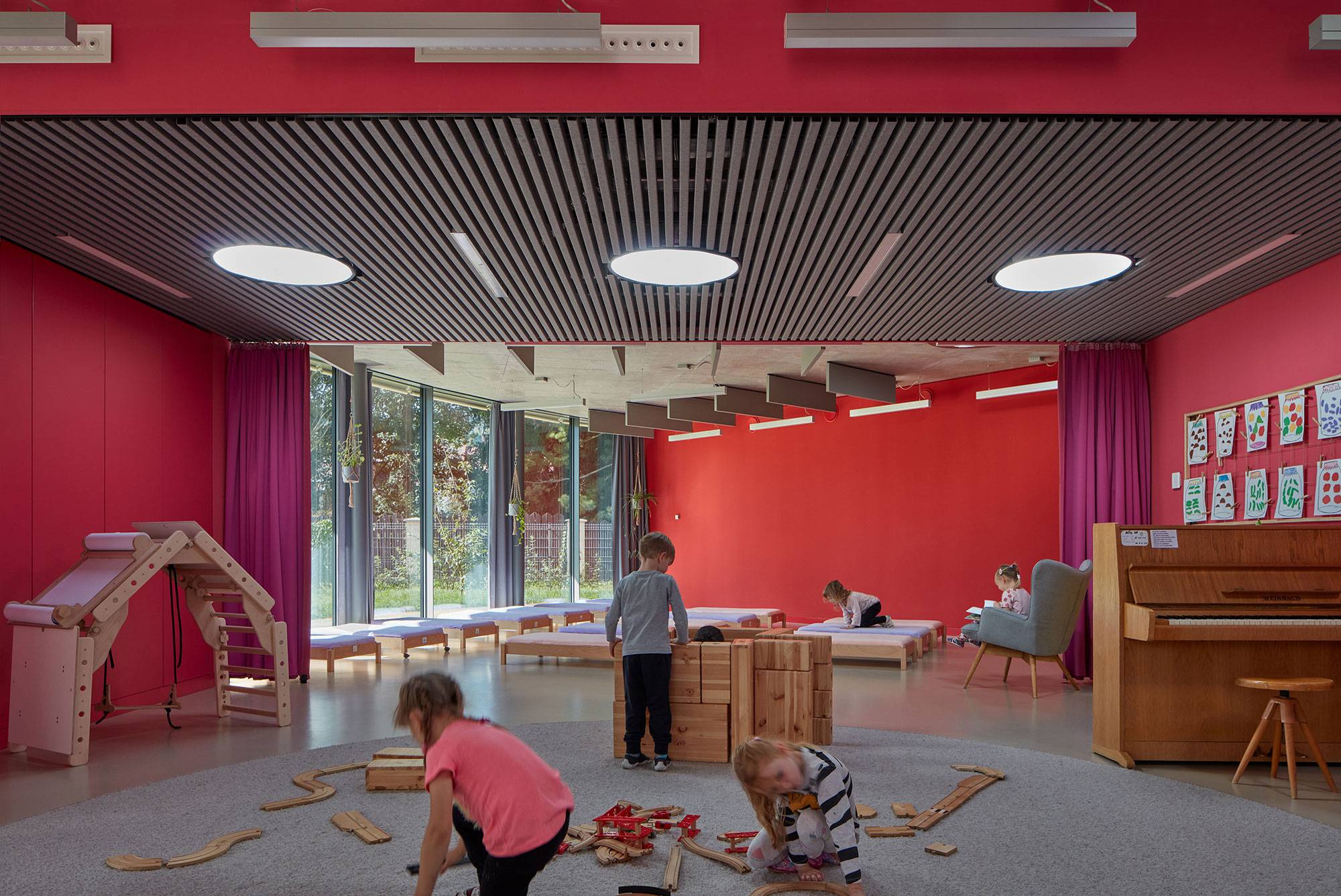 The building, located on the outskirts of Semily town, is designed to be a home away from home for 110 children, aged three to six. The project combines a classic municipal kindergarten and a Waldorf kindergarten in a single building: the aim was to create a building with centralized facilities and a kitchen for two independent kindergartens for children. The classrooms are arranged in a circular pattern around two atriums, that separate the different parts of the building, but also serve as a communication center and space for common activities.