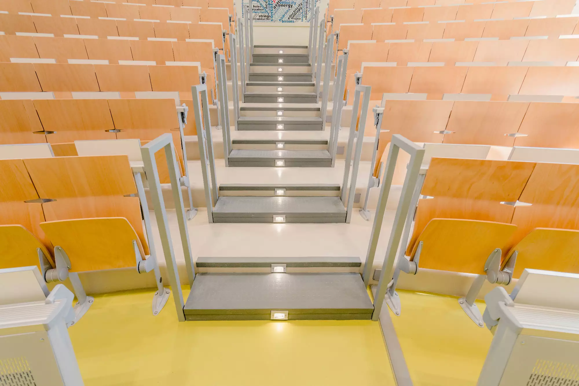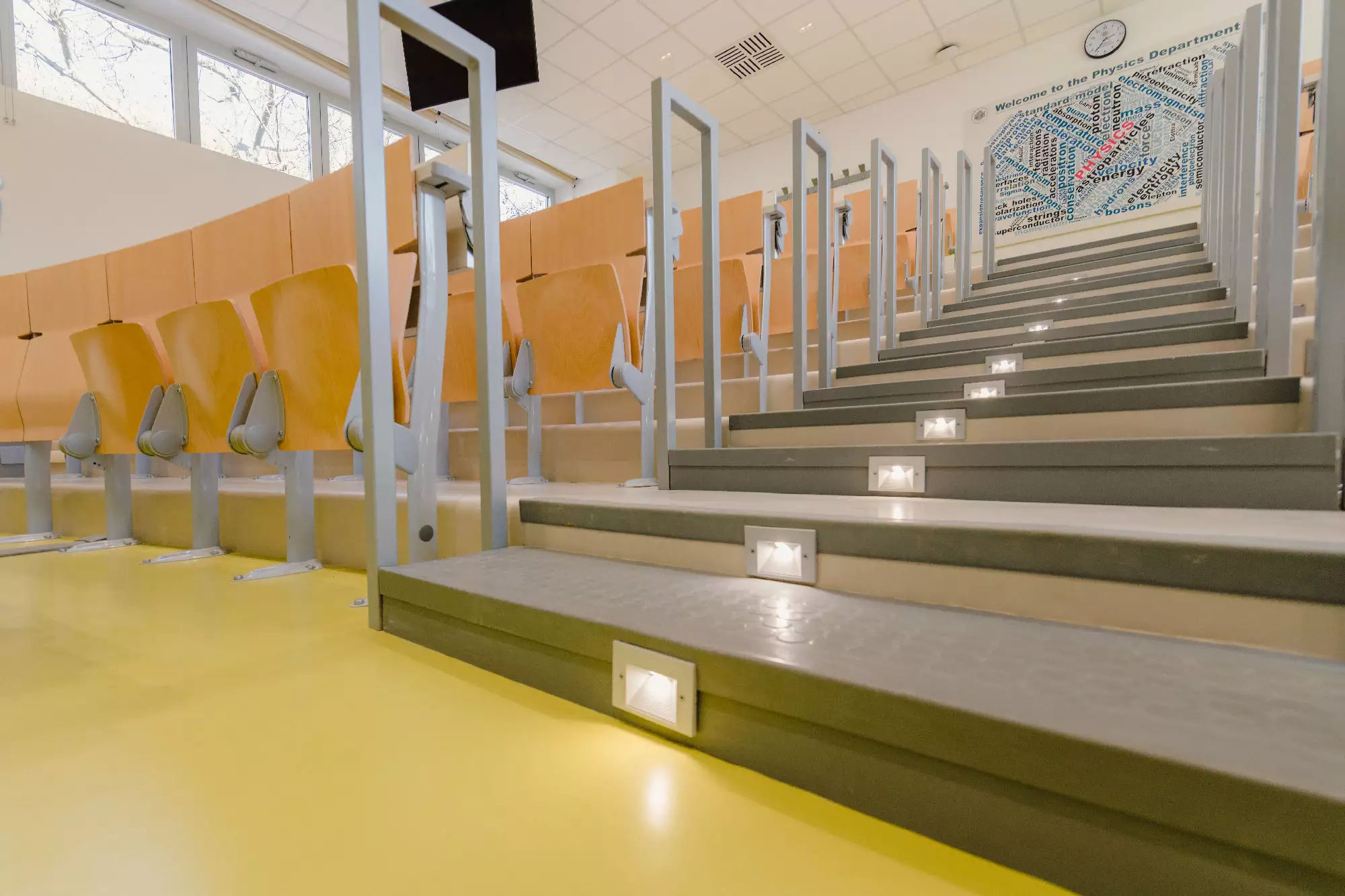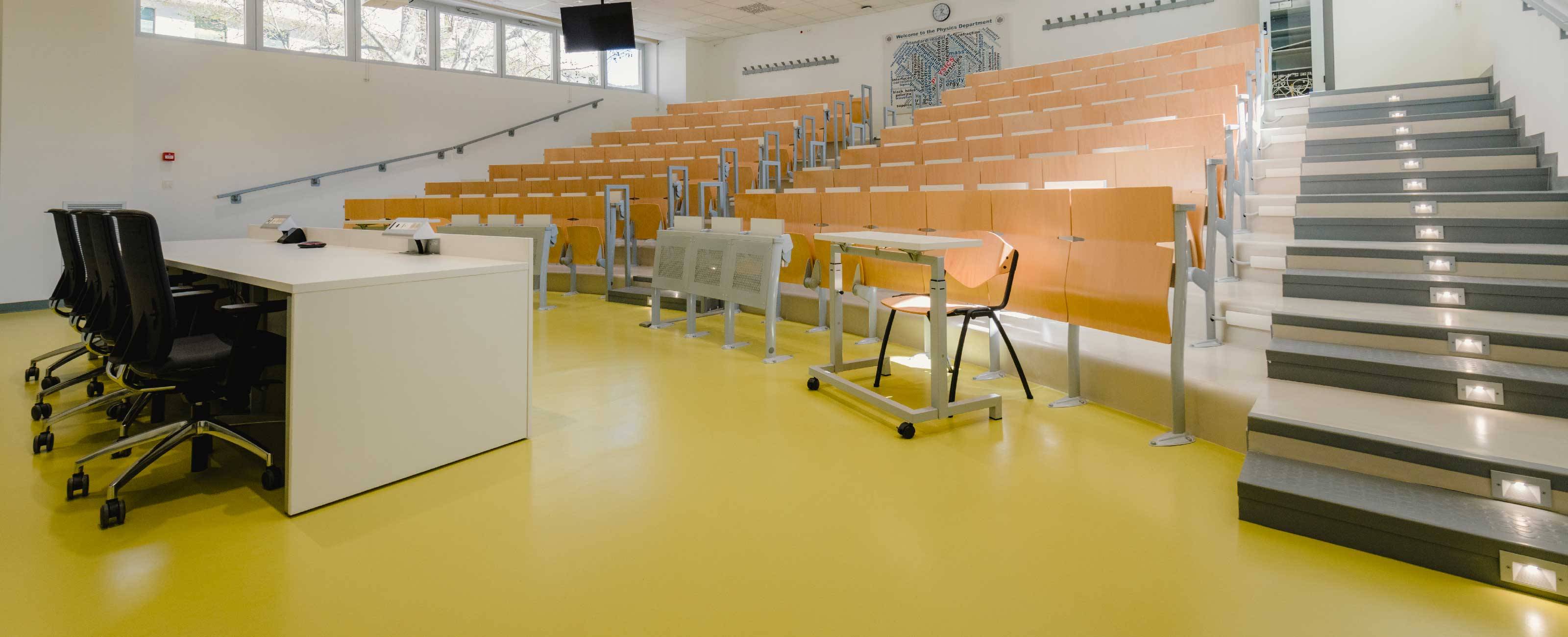 On October 1st, 2009, the three university Departments, already having close links both as regards research and teaching activities, joined together to form the new Department of Physics. The refurbishment of the Aula Magna was completed in 2020. With a surface of 150 sqm, our own Uni rubber flooring is used throughout the space, completed with stairs made with our Fullstep system.