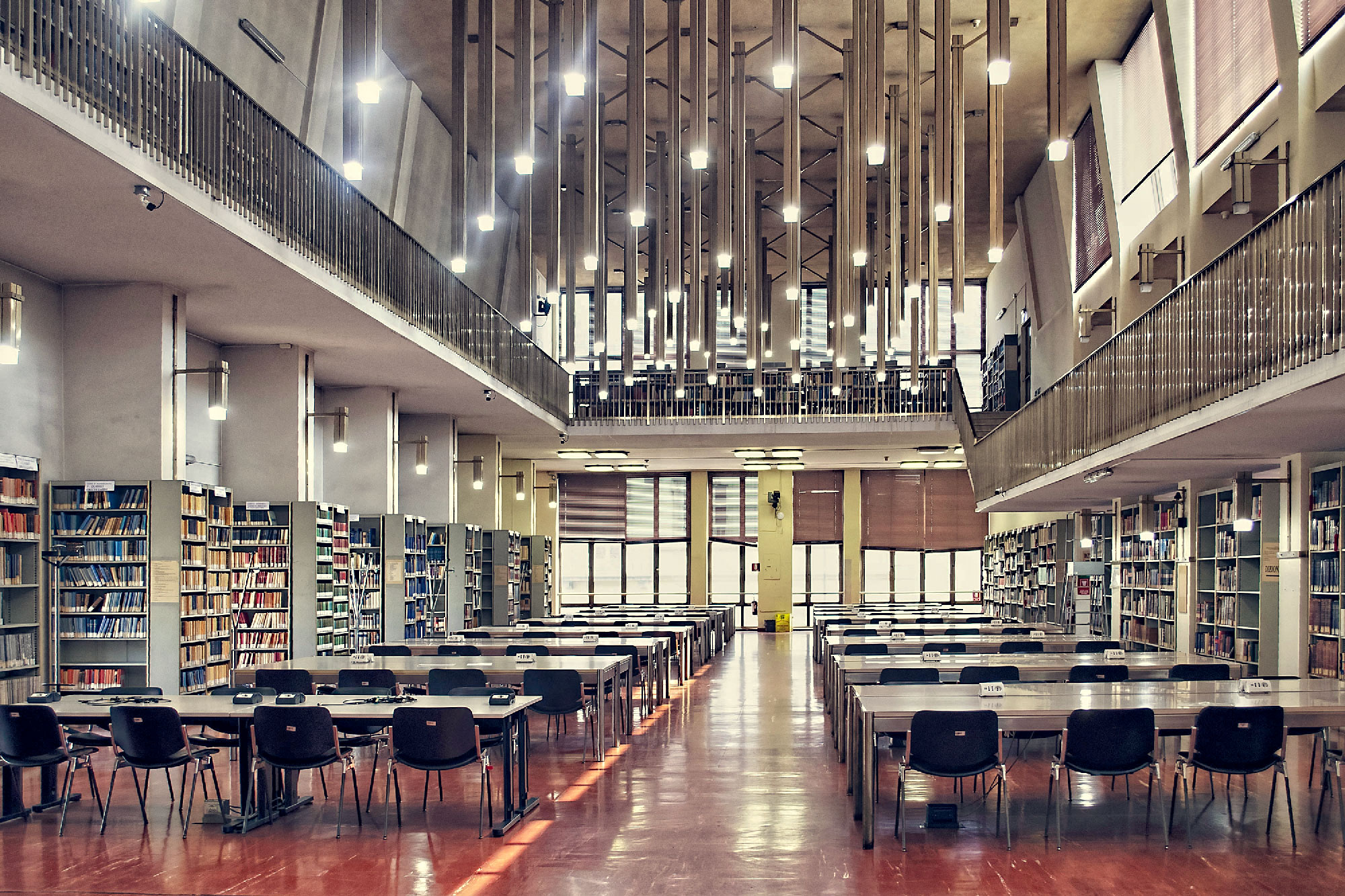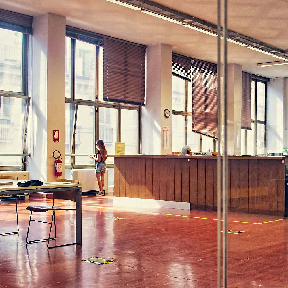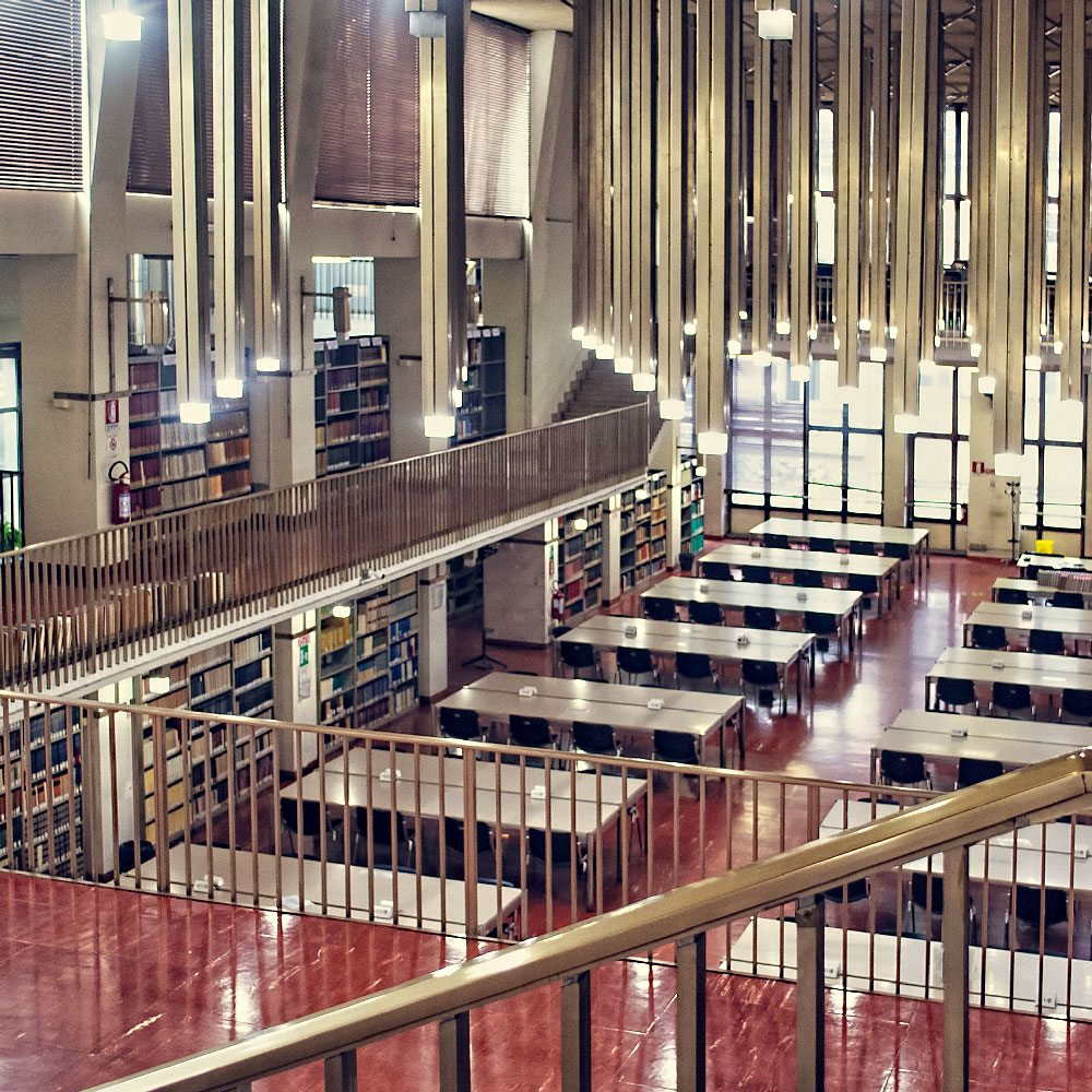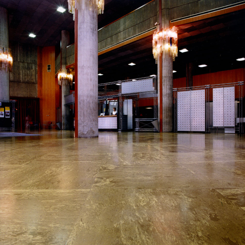 The National Library in Turin was founded in 1723. The construction of the new site, in Carlo Alberto Square, began in 1957, directed by a team that comprised architects Massimo Amodei, Pasquale Carbonara, Italo Insolera, Aldo Livadiotti, Antonio Quistelli. The project was concluded in 1973. That same year the original rubber flooring by Artigo was laid in the public areas and in the great reading room (for a total surface of 10000 sqm) – the very same flooring visitors encounter today, in great conditions and fundamental in the aesthetic definition of the architectural space.